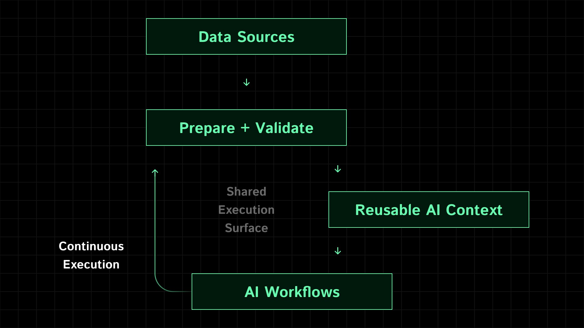 Because ingestion, validation, context, and execution all live in one system, AI is no longer stitched onto the stack after the fact.